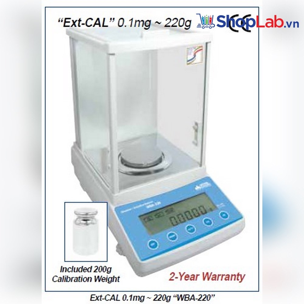 - Cân phân tích WBA-220 được dùng cho các phòng thí nghiệm với độ chính xác 0,1 mg. Cân sử dụng chuẩn ngoại có đi kèm quả cân hiệu chỉnh 200g. |