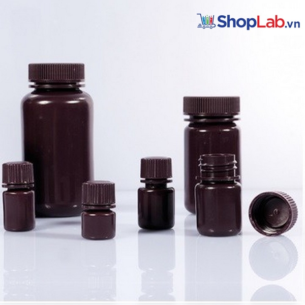 - Chất liệu: thủy tinh - Màu sắc: nâu, tránh ánh sáng - Miệng rộng dễ đong rót hóa chất - Cổ mài, nút đậy bằng nhựa |