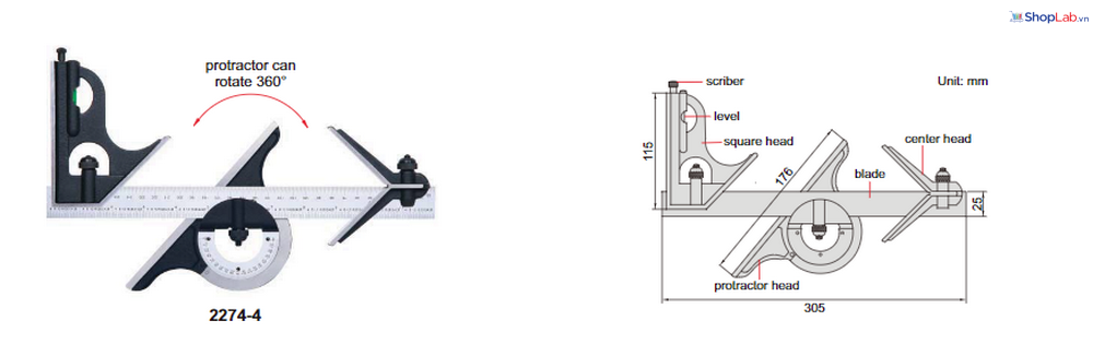 + Đầu định tâm (làm từ gang thép): để định vị tâm của hình trụ có đường kính (Ød): 30-100 mm. Độ chính xác: ± 0,15mm + Đầu thước đo góc (làm từ gang thép): đặt mép thước ở góc mong muốn tại một cạnh của phôi và có thể được sử dụng để đo góc với phạm vi từ: 0-180°, độ chính xác: ±20 min + Đầu vuông (làm từ gang thép): đặt mép thước ở góc 90° hoặc 45° tại cạnh của phôi + Lưỡi dao (làm từ thép không gỉ): dải đo 300 mm/12”, độ chia 0.5 mm và 1/32” ở mặt trước, 1 mm và 1/64” ở mặt sau |